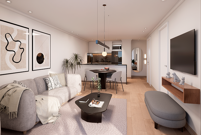 Para este proyecto creamos renders y video tanto del exterior como de los interiores de las tipologías de departamentos y sus amenities