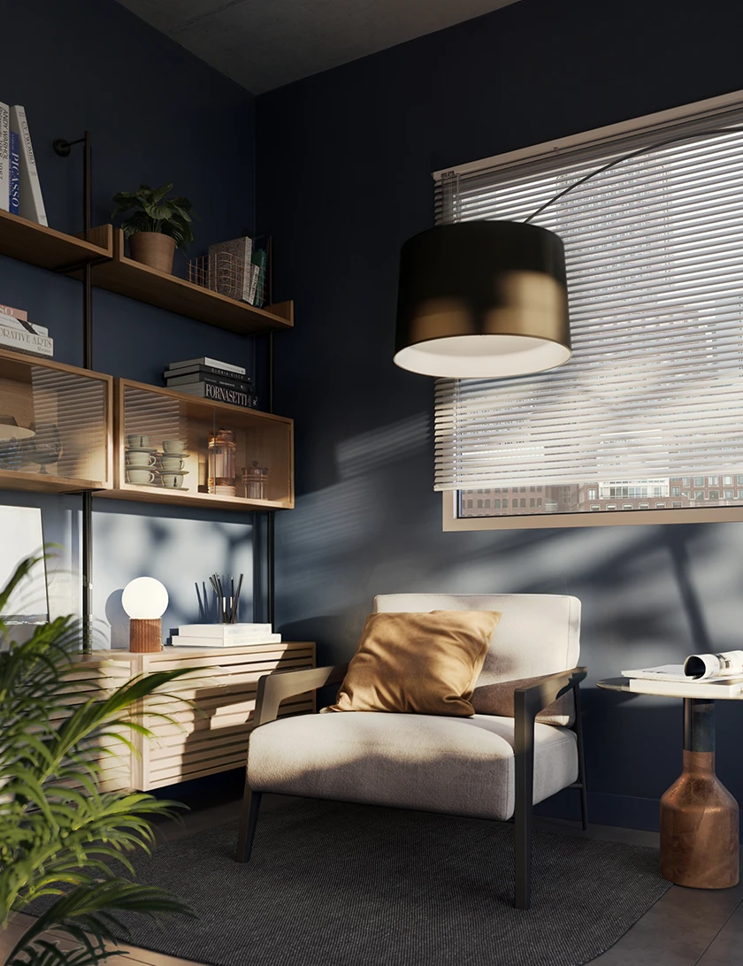 • Oficina personal: Un espacio cómodo con un escritorio gerencial, mueble de guardado y un sillón individual para lectura.