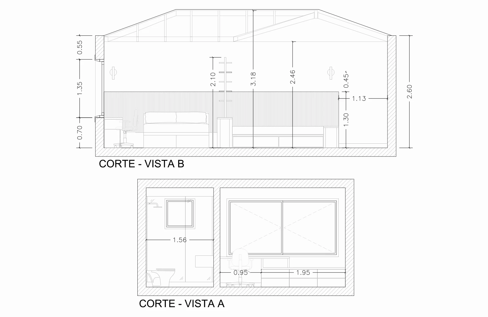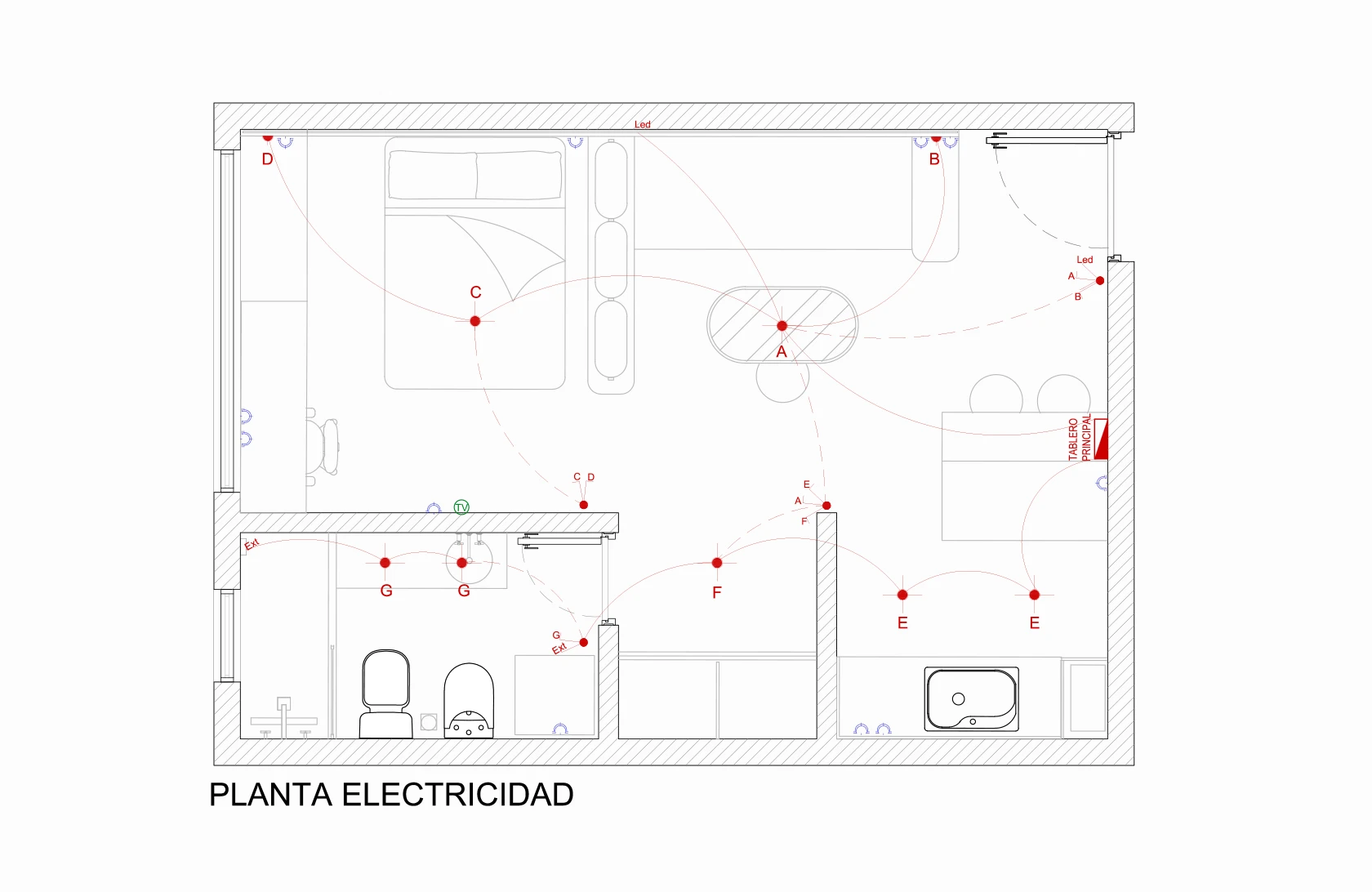 Para reforzar la continuidad de ambos espacios, se hizo un respaldo que cruza el mueble divisor, funcionando de respaldo para cama y sillón, además de instalar un led de punta a punta para generar una luz tenue y general en el depto: