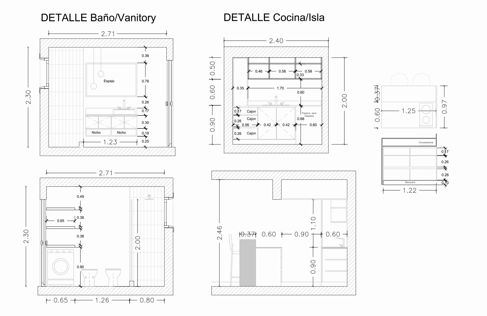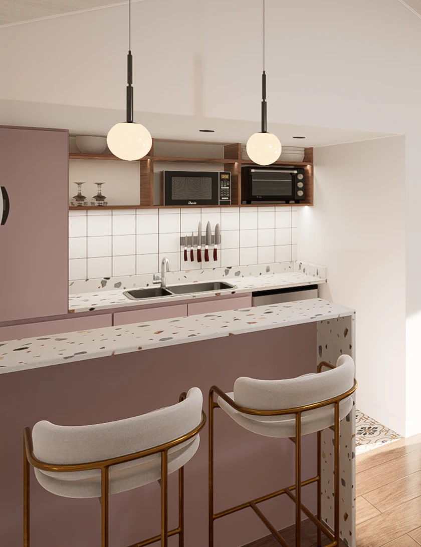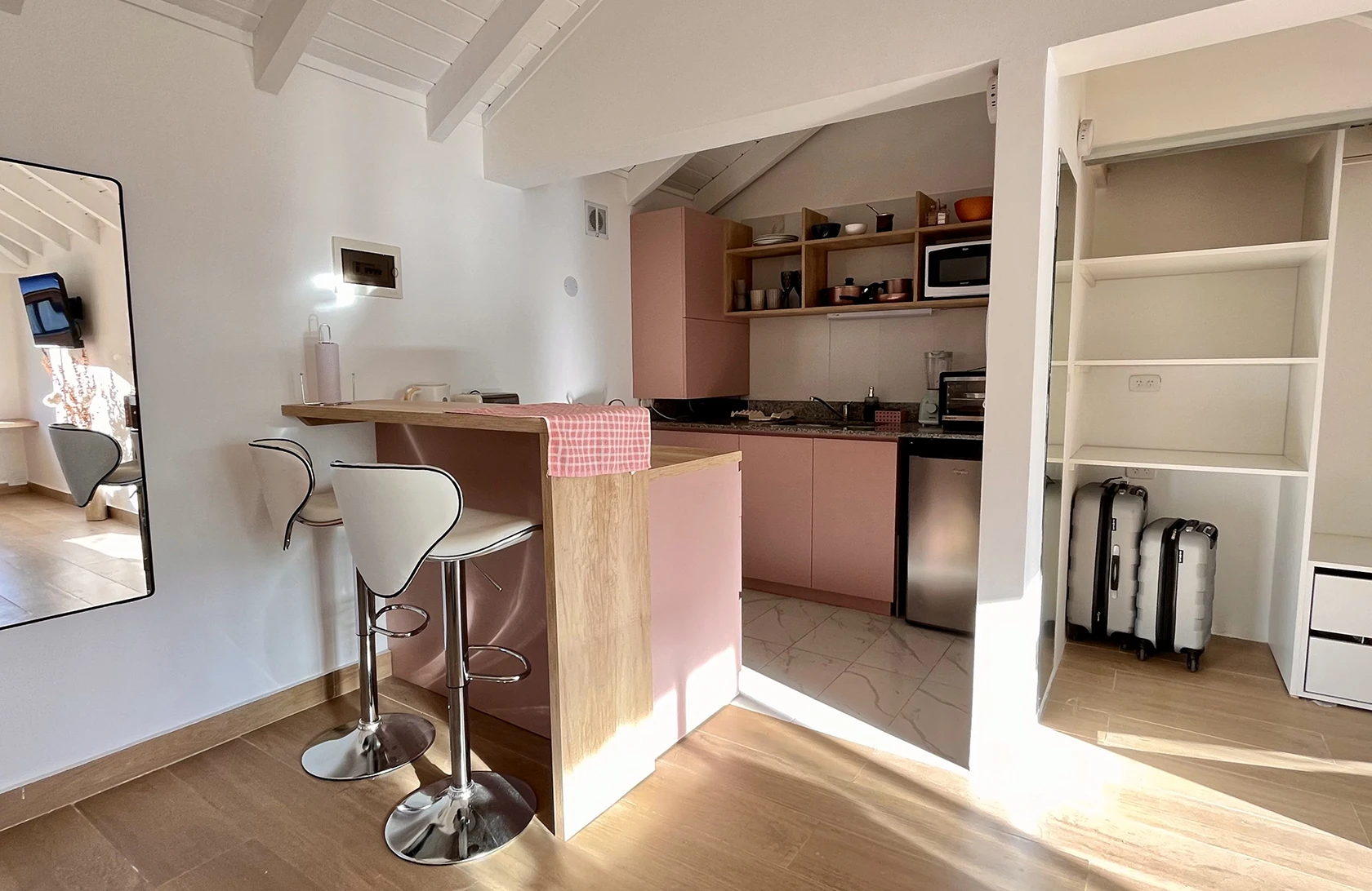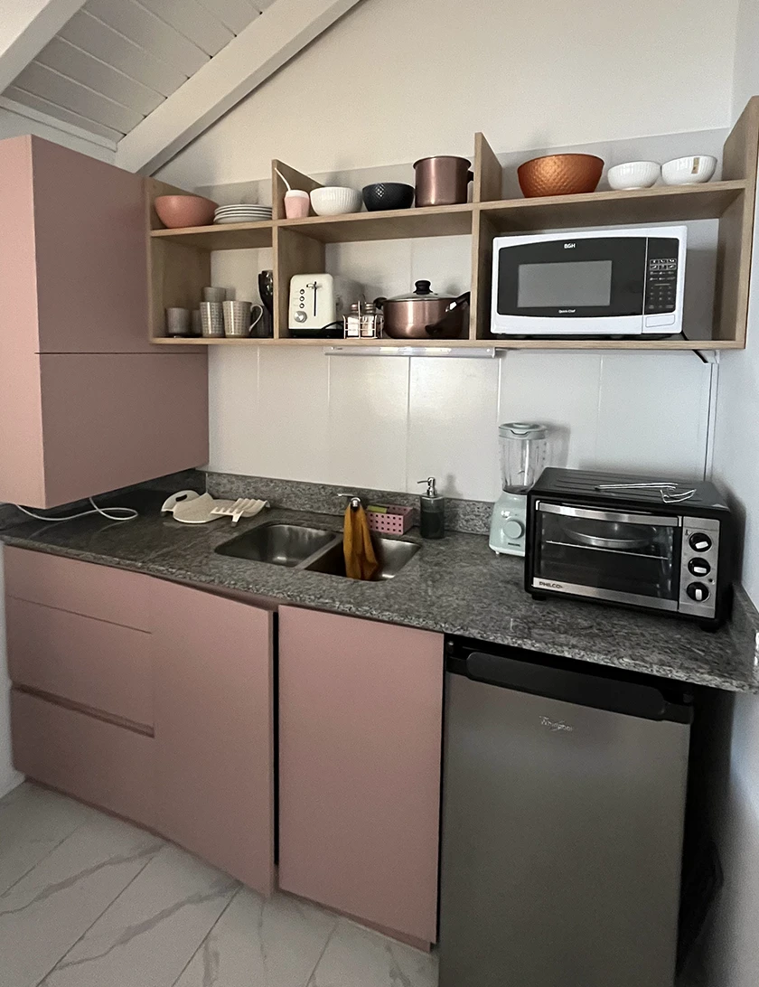 La Cocina por su parte cuenta con barra desayunador, heladera bajo mesada, vitrocerámica de 2 hornallas y espacio para horno eléctrico y tostadora en estanterías.