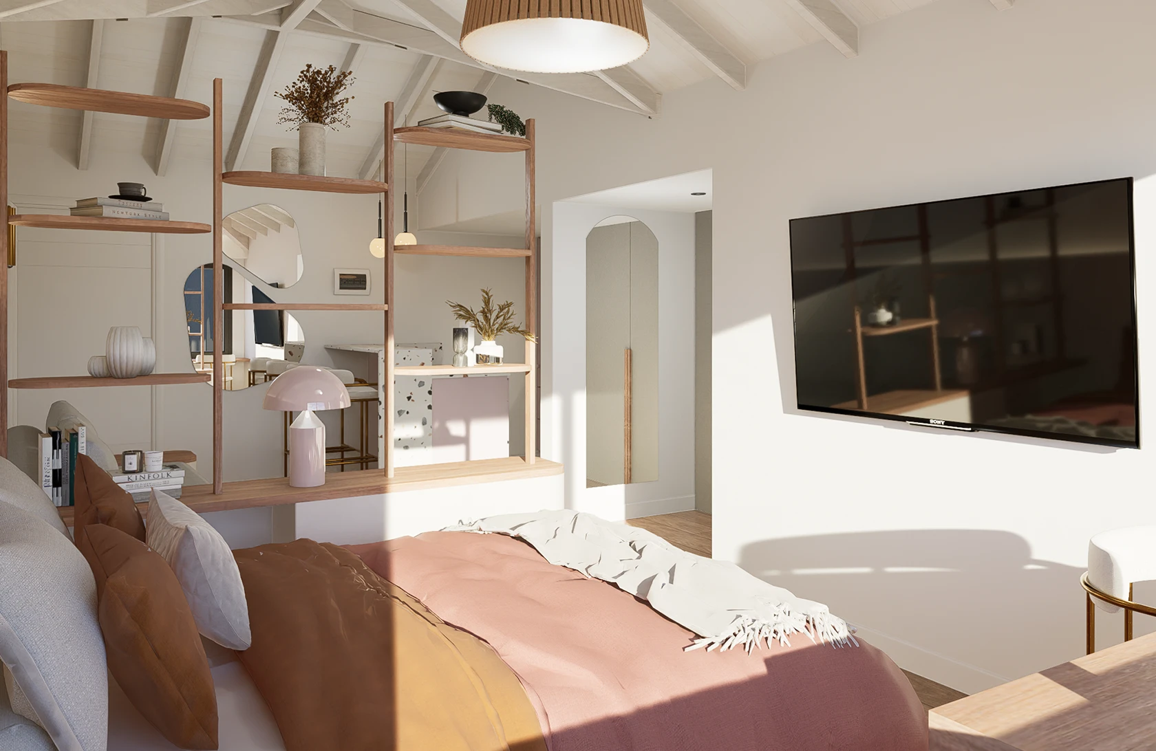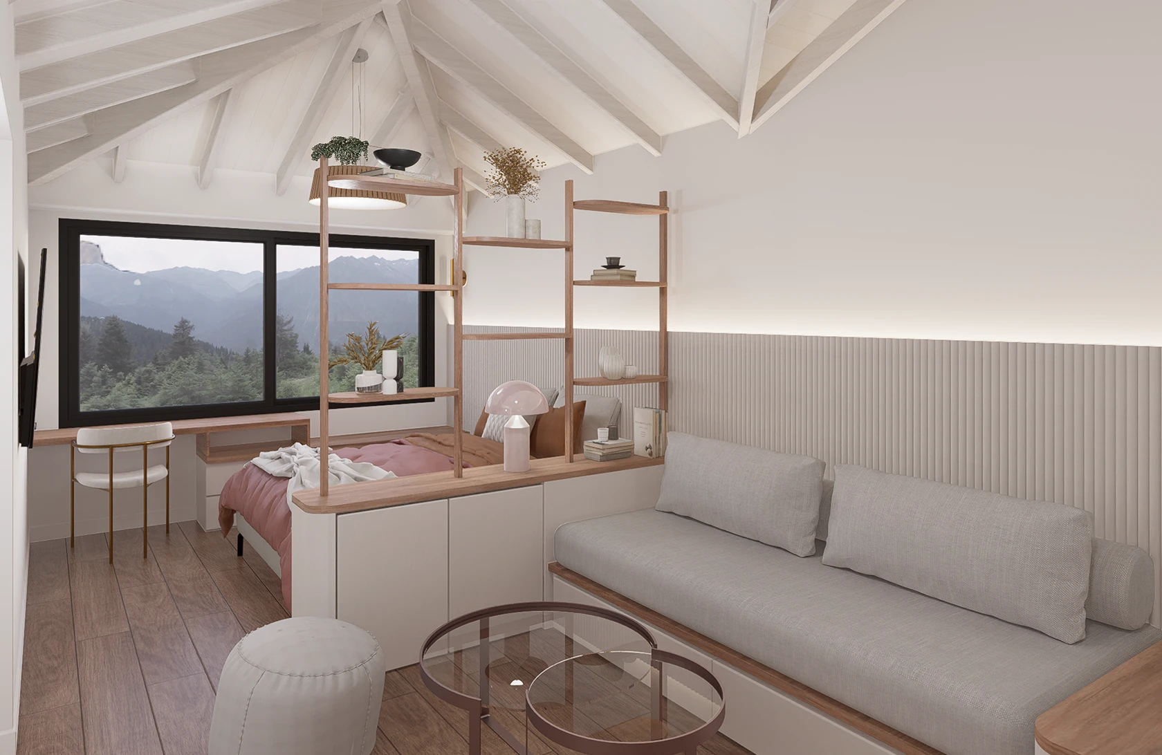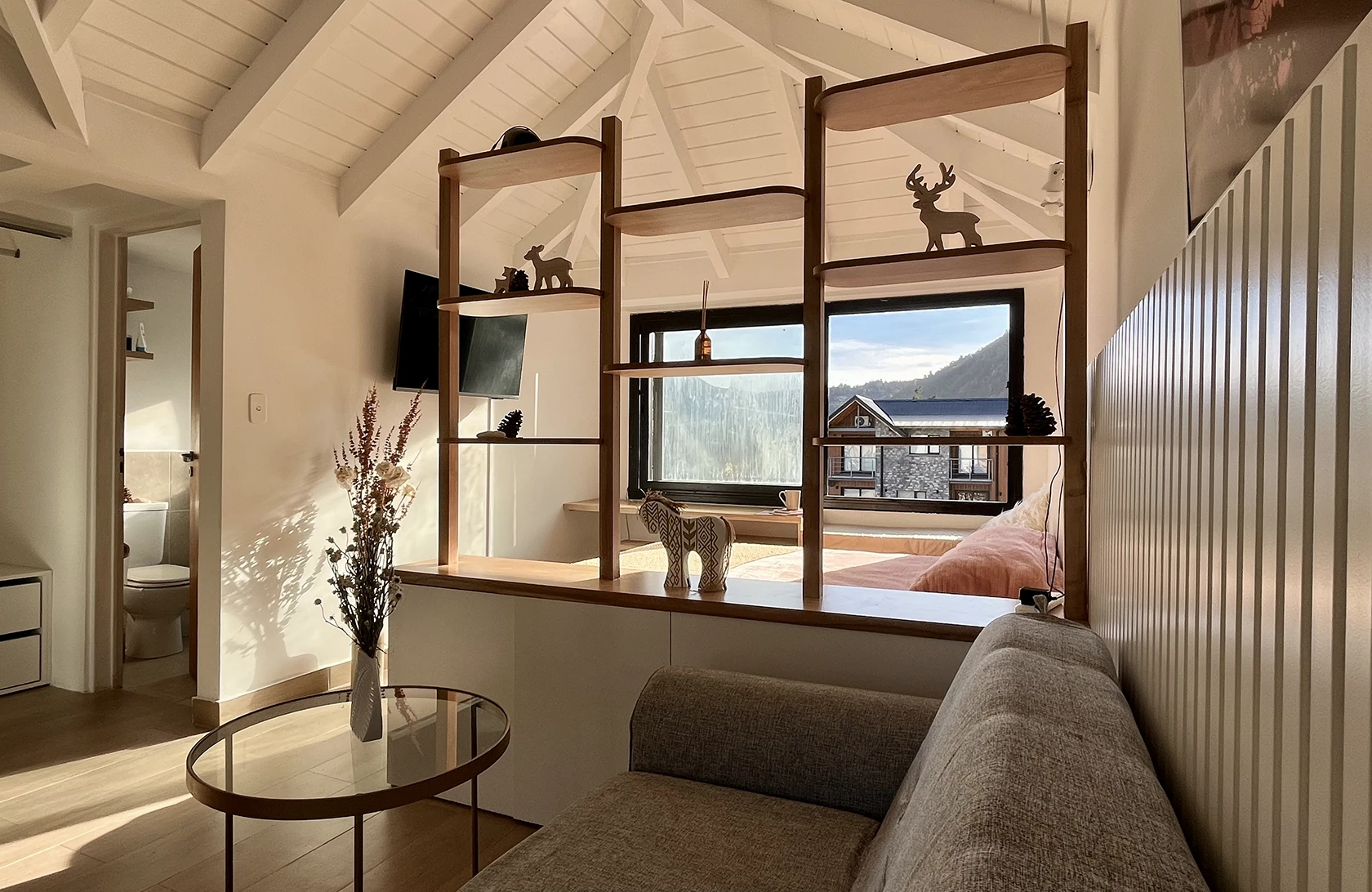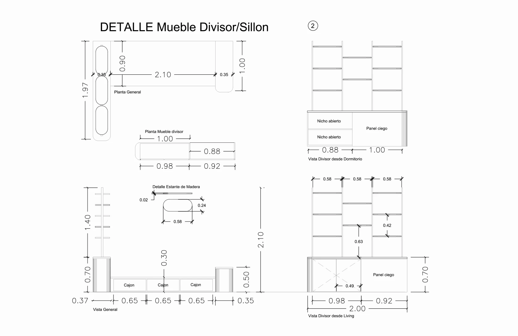 •Divisor: Mueble con almacenamiento inferior y una parte superior que deja pasar la luz, sirviendo de mesa de luz y espacio de guardado.