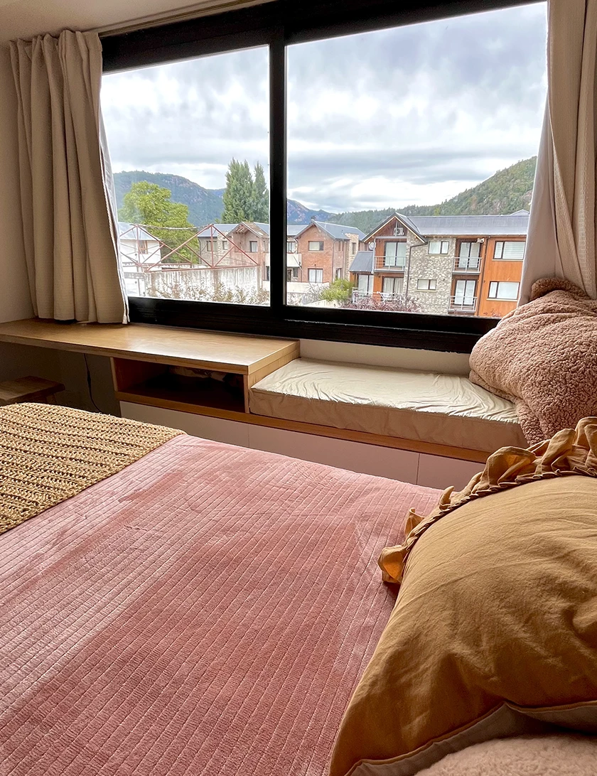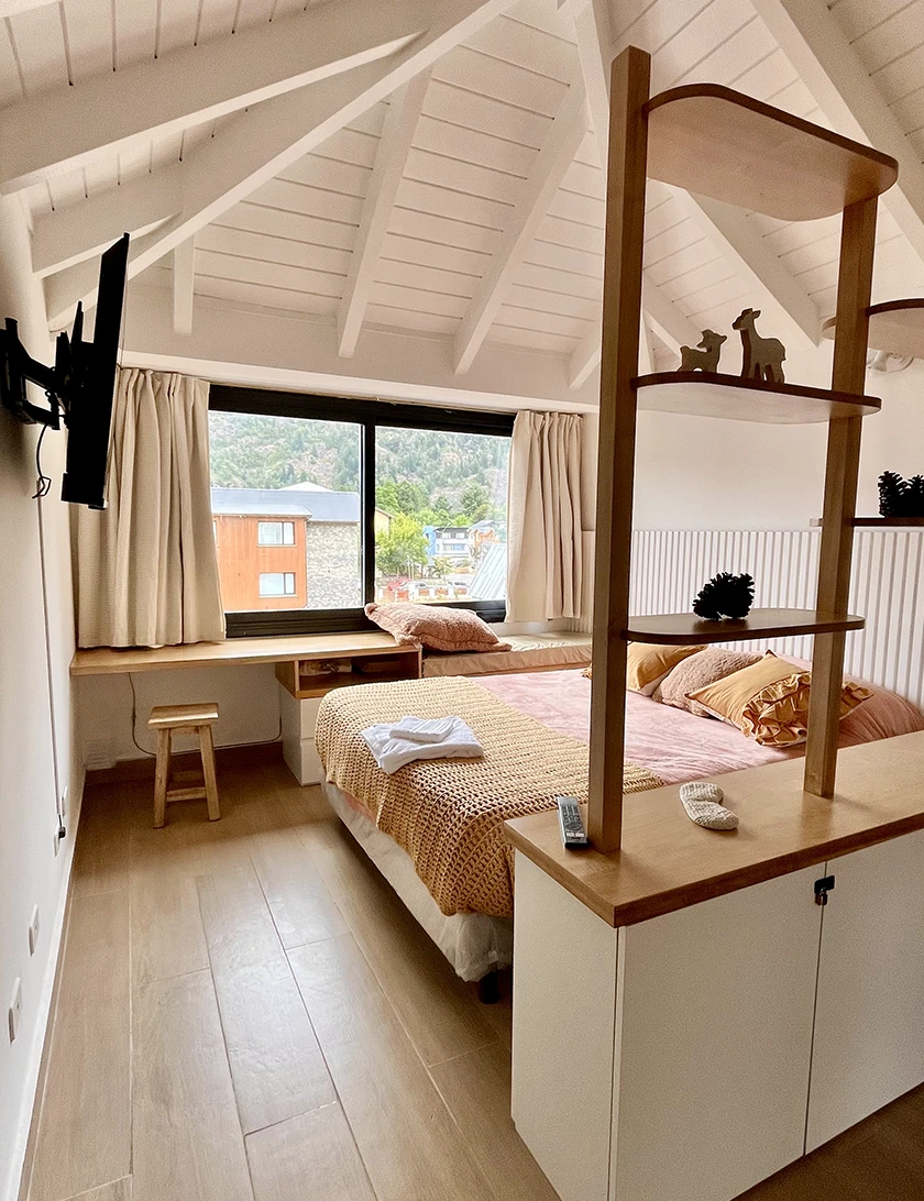 • Habitación: Cama queen, TV, escritorio bajo ventana que se convierte en asiento y mueble de guardado para ropa.