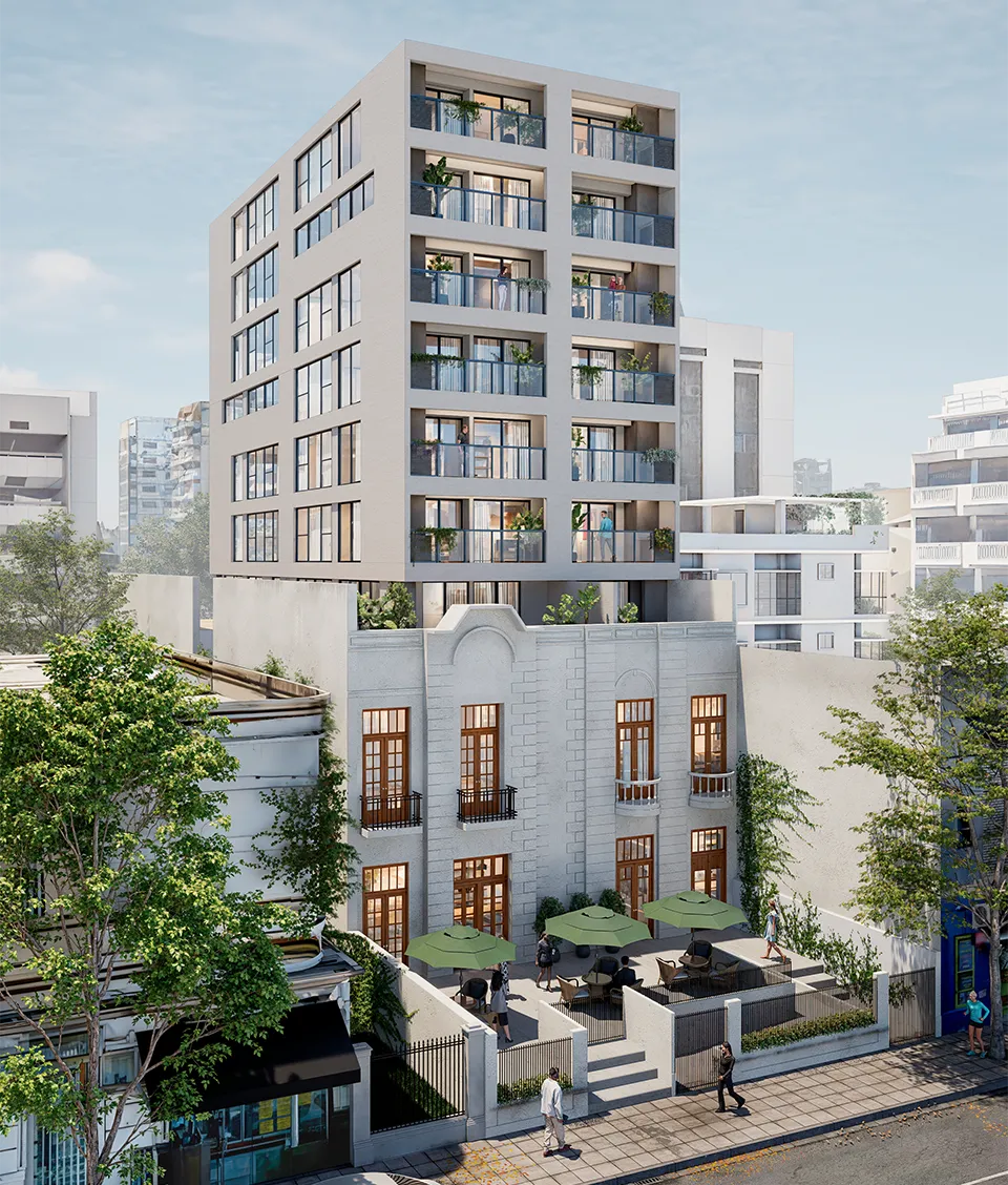 Ubicado en el barrio de Belgrano, el diseño respeta y pone en valor la fachada original del edificio antiguo, manteniendo su estilo y características originales, lo que asegura la continuidad visual del entorno urbano y el respeto por la identidad del barrio.