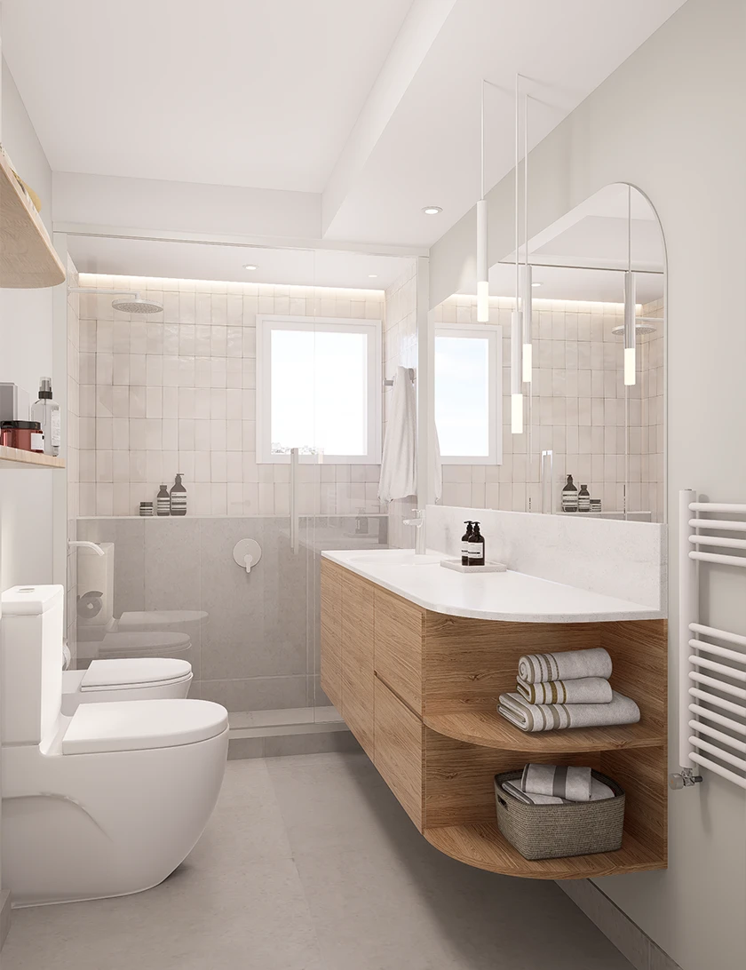 • Reconfiguración de los baños, ampliando uno para generar un toilette de visitas más cómodo y eliminando otro para nuevo sector recibidor/guardarropa.